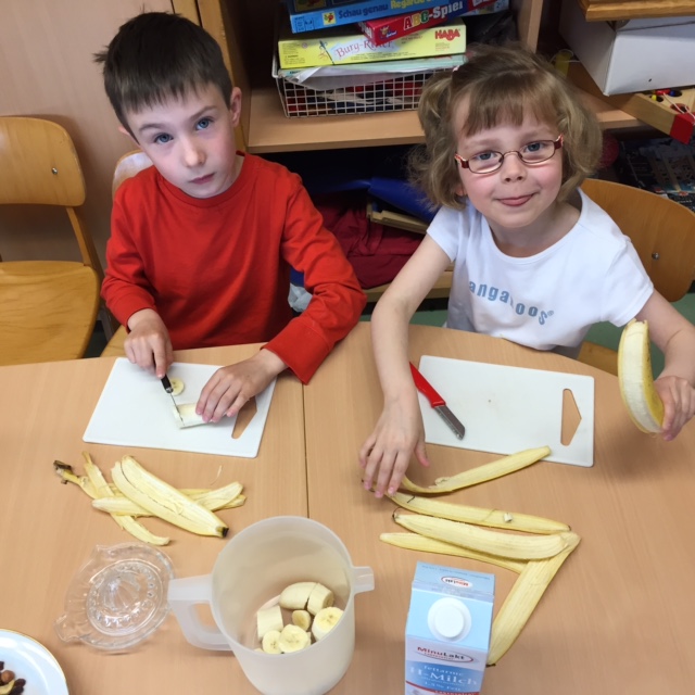 In der G1 war am 31.05.2016 ein besonderer Ernährungstag. Frau Werner brachte Säfte und Getränke aus dem Supermarkt mit und zeigte sehr anschaulich, wie viel Zucker in ihnen enthalten ist. Die Kinder haben verschiedene Säfte getestet und mit einem von ihnen selbst hergestellten Orangensaft verglichen. Auf den Bilder kann man sehen, wie viel Zucker in einem durchsichtigen Becher des jeweiligen industriellen Getränks enthalten ist: Bananen-Milch: 8 Würfel Zucker, Actimel 8 Würfel Zucker, Capri-Sonne 7 Würfel Zucker, Orangensaft 6 Würfel Zucker, Fanta 6 Würfel Zucker. Der selbst gemachte O-Saft war natürlich lecker ohne Ende. Außerdem haben die Kinder noch Zitronenlimonade und Bananenmilch selbst gemacht! Ein gelungener und lehrreicher Vormittag.